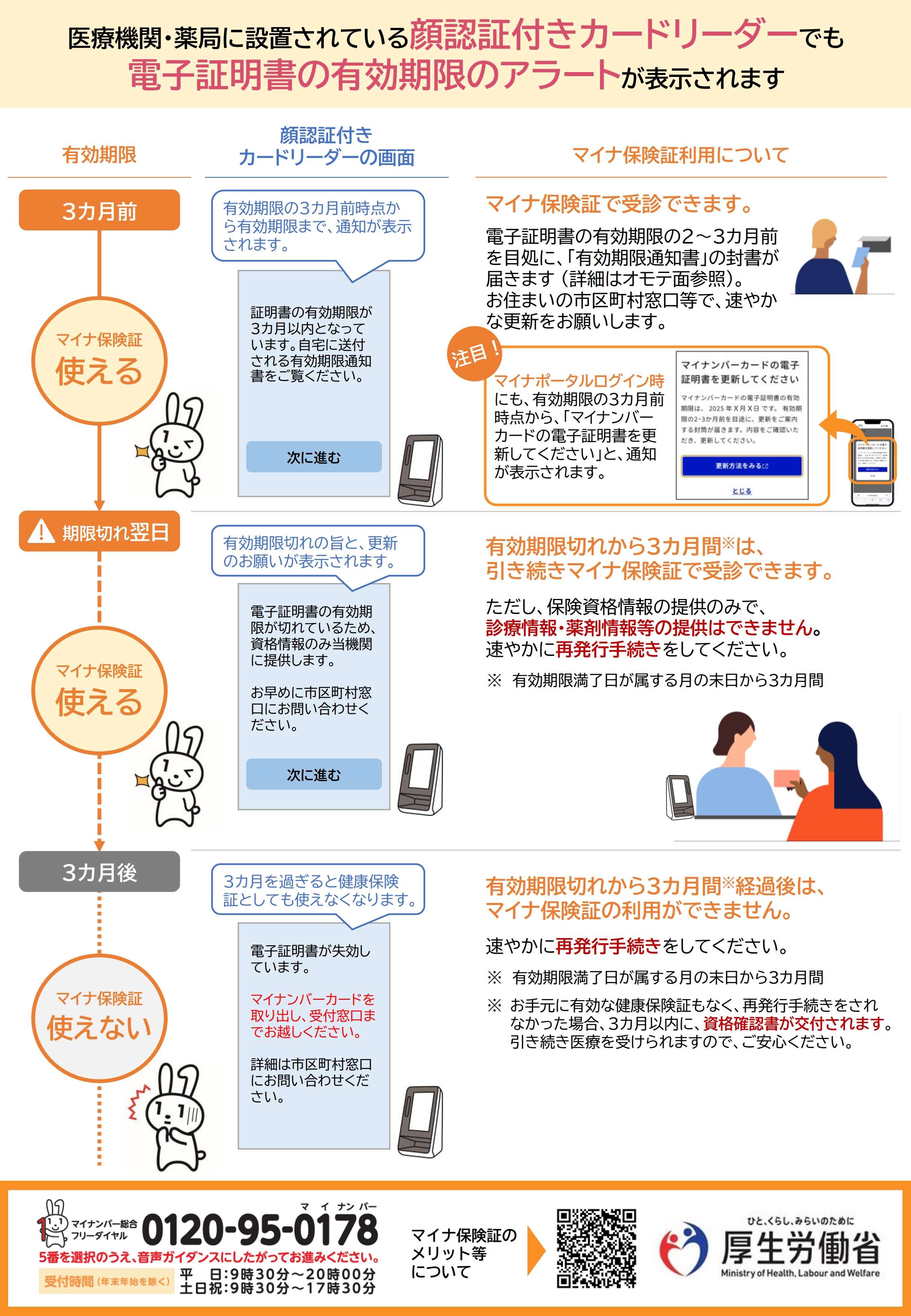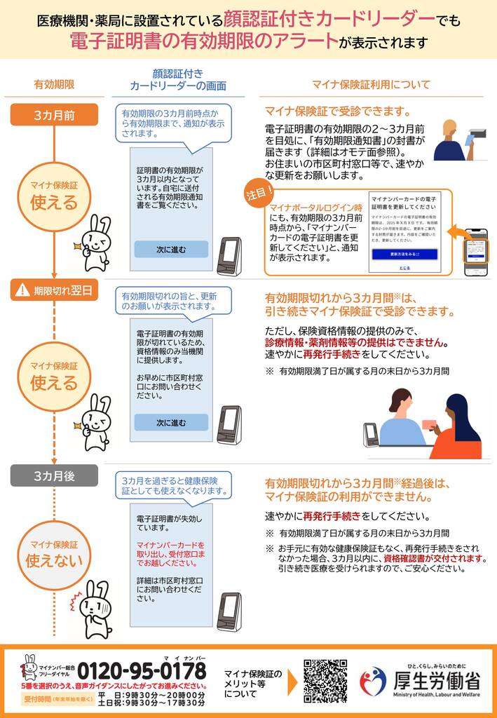 なお、マイナ保険証については、マイナンバーカードに挿入されている電子証明書の有効期限がありますので、予めご確認しておかれると万が一のトラブルを回避できます。